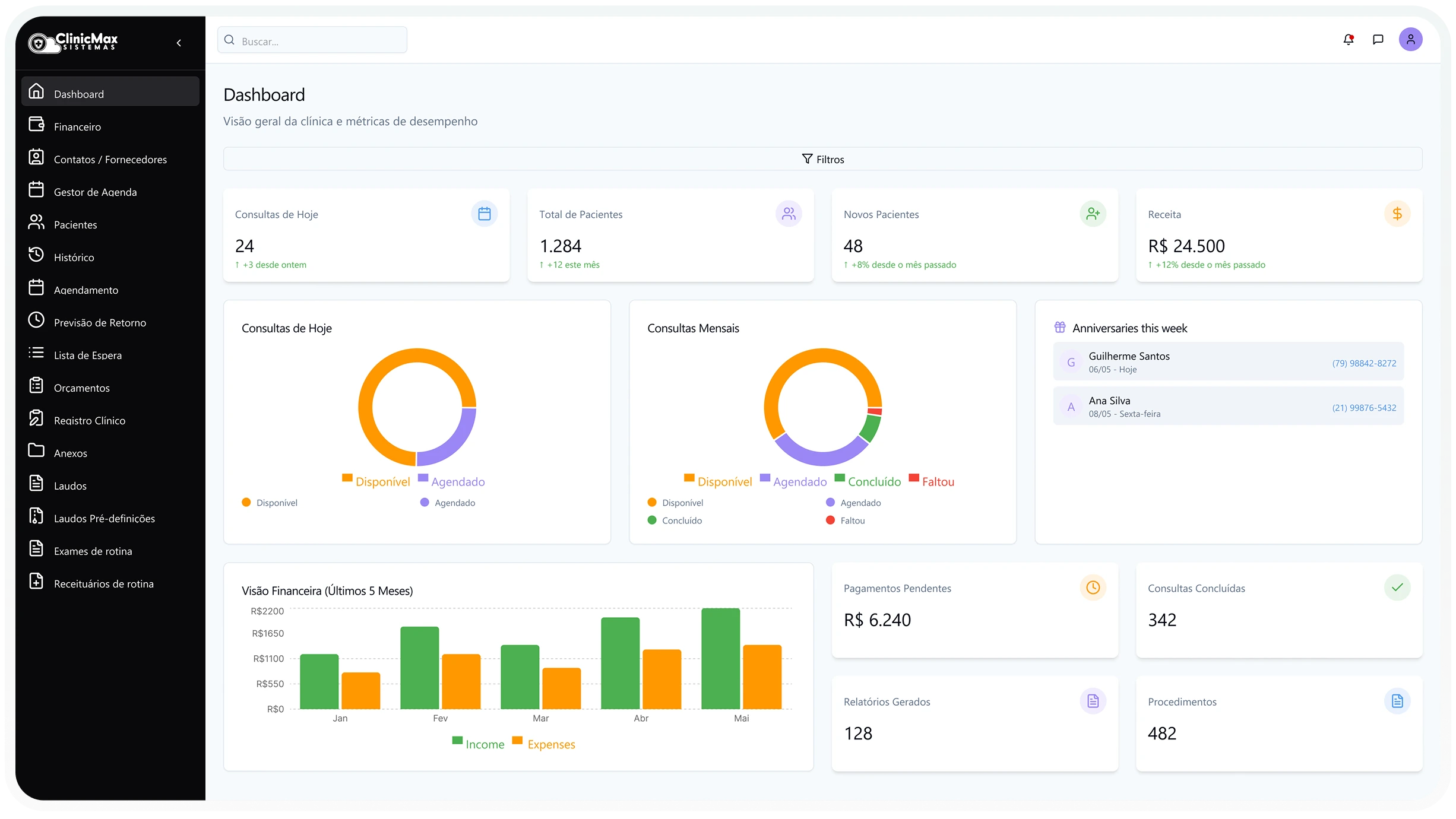 Simplifique a gestão financeira da sua clínica com total controle. Organize pagamentos, acompanhe o fluxo de caixa e facilite a cobrança de pacientes de forma prática.